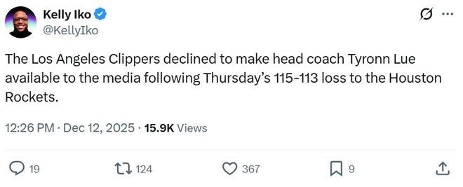 更为诡异的是,赛后火箭队记Kelly Iko曝出,快船队拒绝泰伦卢赛后接受采访。