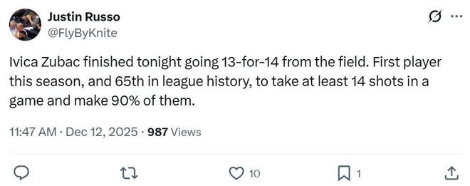 凭借这样的表现,祖巴茨成为本赛季首位,也是NBA历史上第65位单场至少出手14次且命中率达到90%的球员。