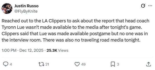 快船记者Justin Russo迅速询问快船人员,后者给出的解释是客场作战,泰伦卢可以接受采访,但采访室里面根本就没有人。