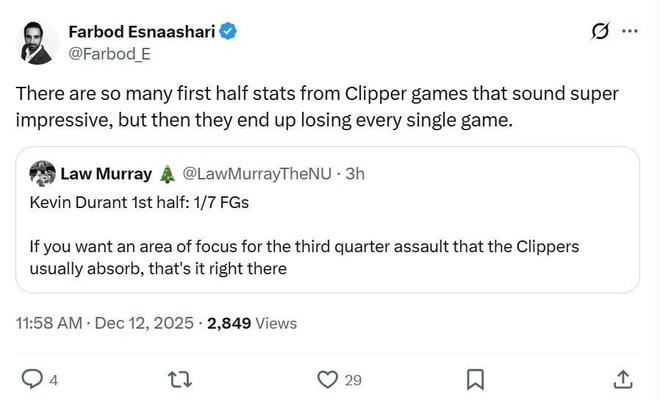 正如赛后快船随队记者Farbod Esnaashari所说,快船队上半场总能交出惊艳的表现,但最终也会输掉每一场比赛。